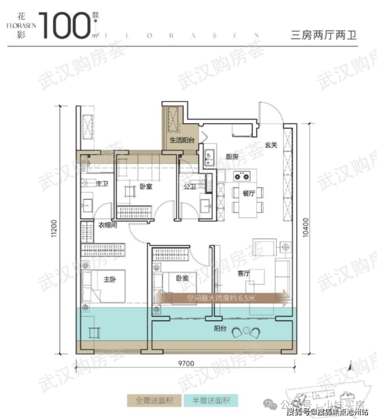 汉阳城更·花木深目前公示了5个户型,分别是100、104、109平的三房两卫,以及125、145平的四房两卫。