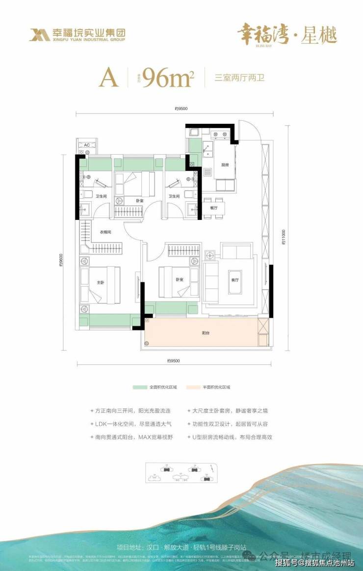 1、优化后空间使用率最高约97%;2、方正南向三开间;3、LDKB一体化空间;4、南向贯通式阳台;5、大尺度主卧套房;6、功能性双卫设计;7、U型厨房流畅动线。