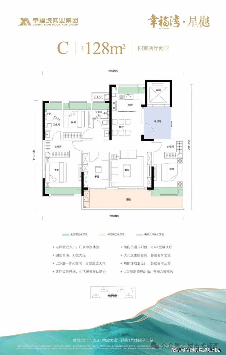 1、优化后空间使用率最高约94%;2、整层全部为128㎡户型,圈层纯粹;3、电梯临近入户,电梯厅前室无其他住户共享;4、四面宽朝南;5、LDKB一体化空间;6、大尺度主卧套房;7、南向贯通式阳台;8、L型厨房流畅动线;9、功能性双卫设计。