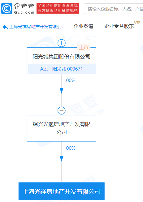焦点财经快讯 2月20日,焦点财经获悉,上海光祥房地产开发有限公司成立,法定代表人为张翼,注册资本1亿元人民币,经营范围包含:房地产开发经营。企查查股权穿透显示,该公司由绍兴光逸房地产开发有限公司100%控股,后者为阳光城全资子公司。 图源:企查查