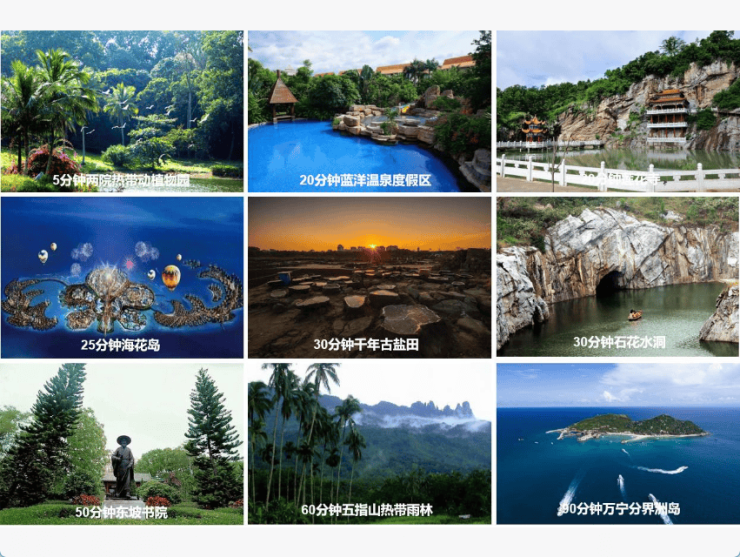 5-10分钟可达景点:两院热带植物园、云舍松涛、兰洋氡温泉、人民英雄纪念碑等。