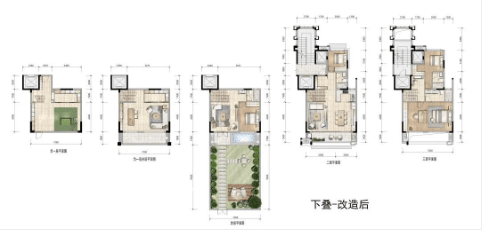 中叠以131平方米建面打造约300平方米的实际可用空间,实用率高达200%。这栋共4层的叠墅,位于地上一、四、五层和地下一层,与中式传统建筑风格相得益彰。其中一层北向花园和会客厅,四层则是餐厅、厨房和一间卧室,三层则规划了休息区,共有3间卧室。两个归家路线设计使出入更为便捷,让居民享受方便的生活方式。