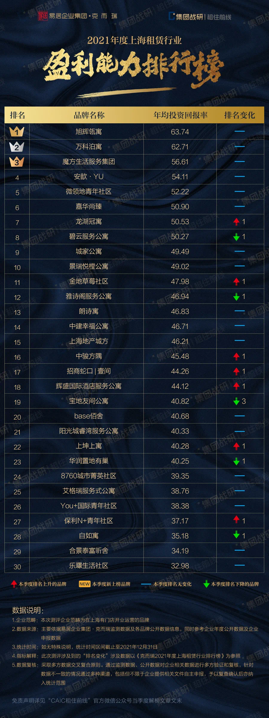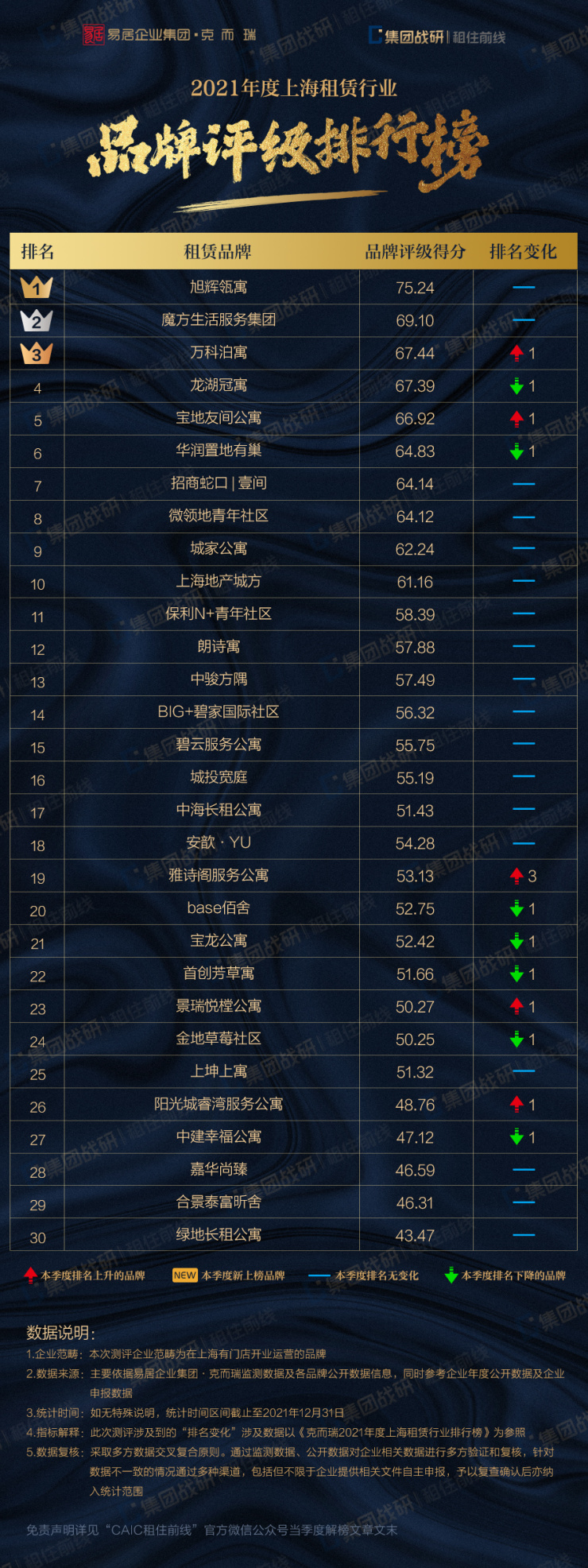克而瑞所发布的“2021年度长租公寓榜单系列”系以易居企业集团·克而瑞市场监测数据为基础,通过多维度数据监测、多元化综合评判所生成的半年度测评排行榜,为尽可能保障公开数据和监测数据的逻辑和维度一致性,对于未监测到的部分租赁企业及品牌数据,不纳入榜单统计范围。克而瑞明确表示,上述榜单内容为独立见解仅供参考,克而瑞不对使用上述榜单及其内容所引发的任何直接或间接损失承担责任,且就榜单相关内容享有全部的解释权。