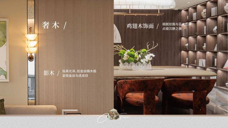 法国木纹石、影木、实木复合木地板及奢侈皮料等,以恰到好处的温度与柔和,为生活洒下一抹静谧。