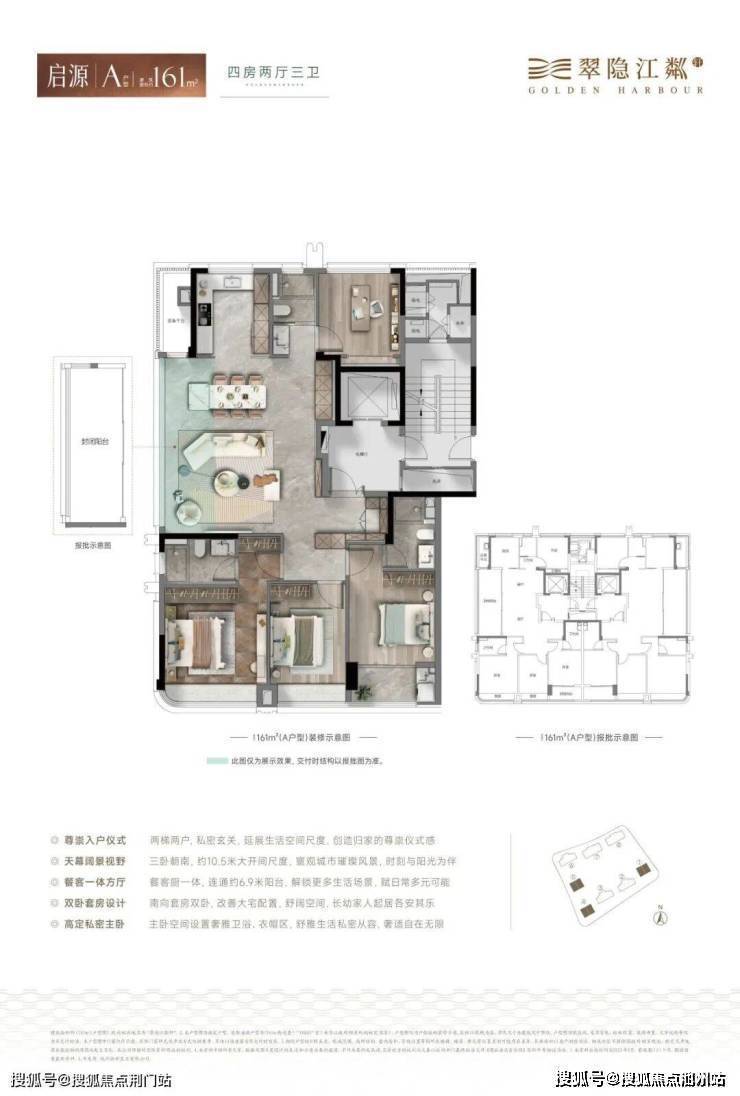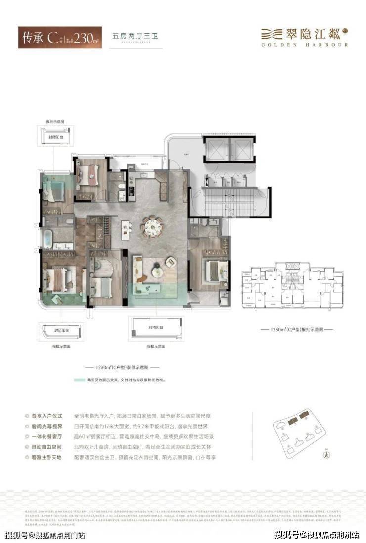 在杭州目前新房市场中,使用率能真正做到约90%的楼盘,凤毛麟角。翠隐江粼轩通过封闭阳台只算半面积+电梯厅空间转化(公区),实现使用率最大化。建筑面积约230㎡户型更是做到了近66㎡客餐厅+双套房布局,空间感媲美很多二手老豪宅的260㎡。