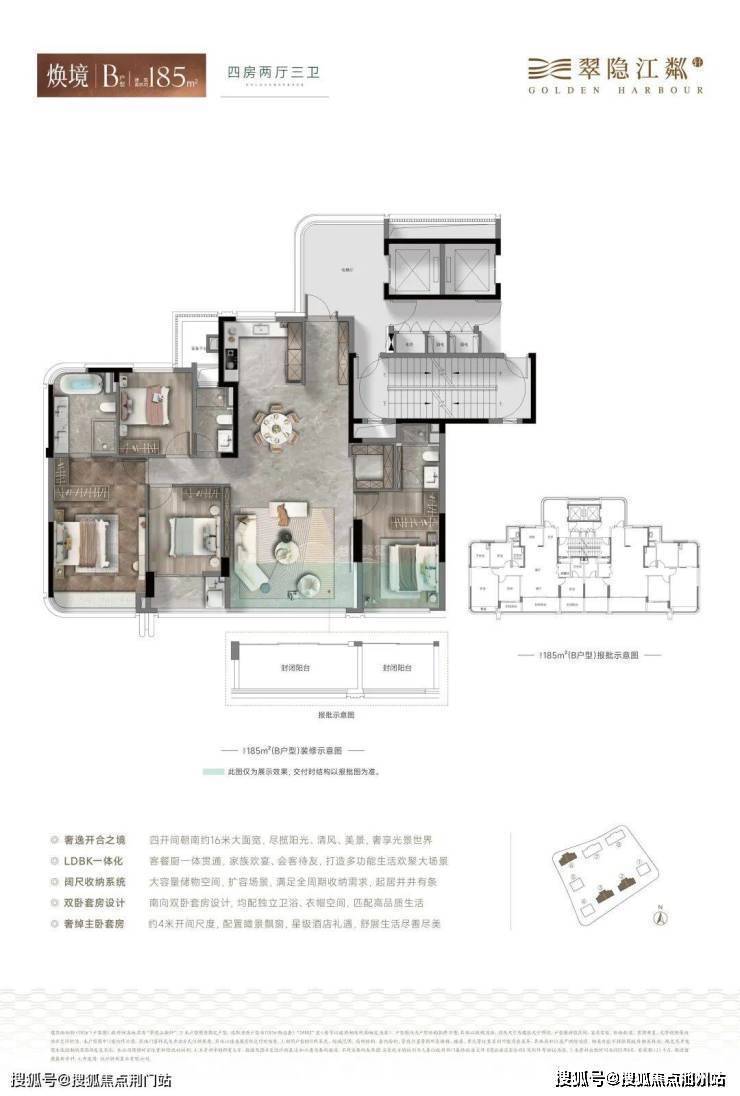 高使用率户型:主力户型为161㎡、185㎡、230㎡,实际使用率约90%,部分户型带全明电梯厅,空间感强。