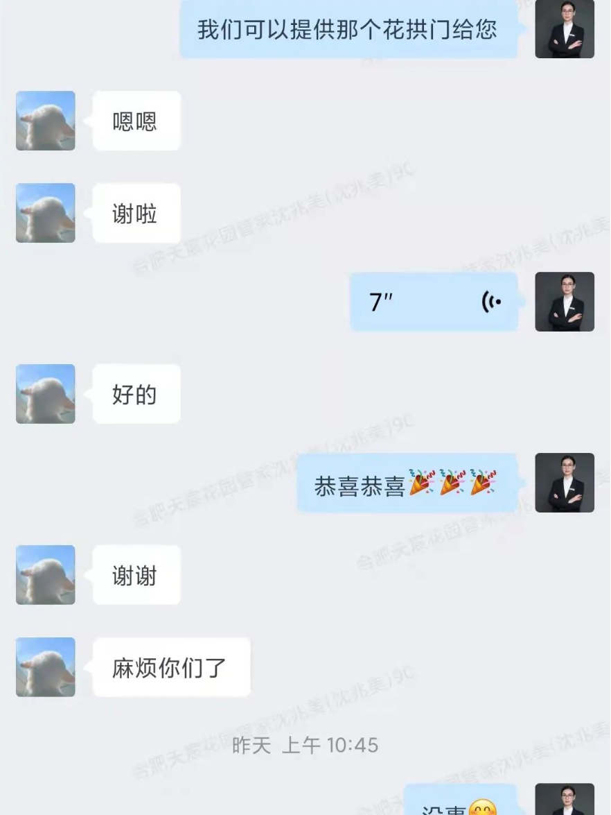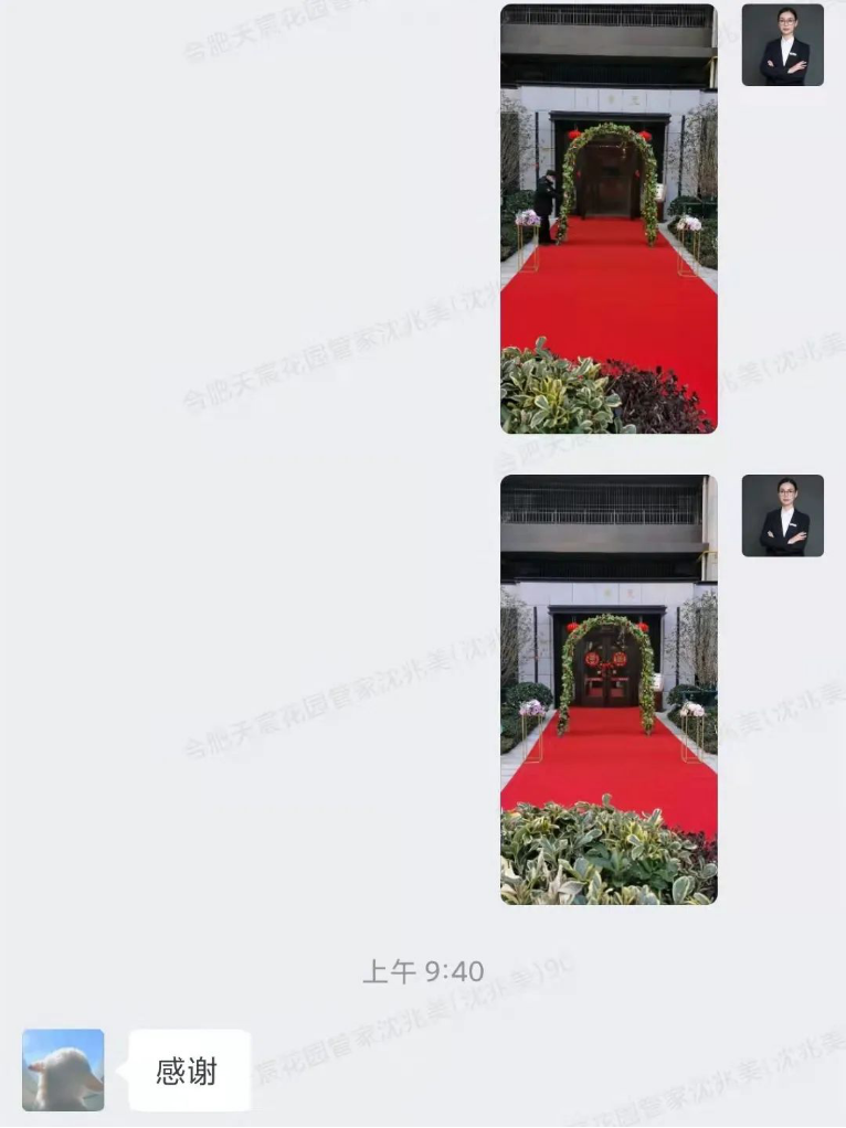 合肥天宸花园32栋204业主,近日微信联系客服管家咨询婚车小区路线怎么走。管家沈兆美向业主表示新婚祝福的同时,积极向业主推荐物业的花拱门和红地毯服务。业主表示欣然接受,而后,管家安排保安布置好花拱门,铺上新地毯,摆放好花,贴上喜字,以暖心行动为业主送上了真诚的新婚祝福。