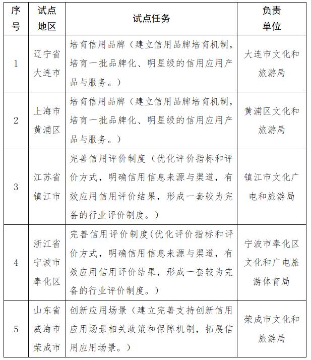人民网北京12月7日电 (记者刘佳)为贯彻落实党中央、国务院关于健全社会信用体系的决策部署,按照《国务院办公厅关于加快推进社会信用体系建设构建以信用为基础的新型监管机制的指导意见》(国办发〔2019〕35号)关于“组织开展信用建设和信用监管试点示范”、《“十四五”文化和旅游发展规划》关于“拓展信用应用场景”、《“十四五”文化和旅游市场发展规划》关于“探索开展信用经济发展试点工作”等要求,文化和旅游部启动了文化和旅游市场信用经济发展试点工作,确定辽宁省大连市等14个地区为文化和旅游市场信用经济发展试点地区。
