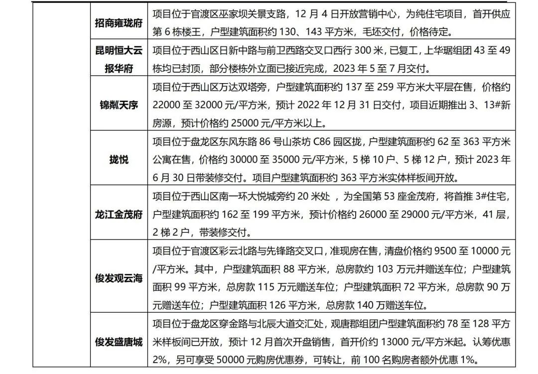 焦点研究院监测显示,受政策环境承压、购房需求观望情绪升温等因素影响,昆明项目以价换量愈演愈烈,主城五区已出现单价不足一万元的特价房源,这意味着成交价格仍有下行空间,预计在 12 月进一步延续。不过,一些年内计划开盘销售的项目,因各种原因无法如期开盘销售,面对如此市场环境,可能会进一步推迟开盘销售的计划。尽管一线城市市场有所回温,市场出现松动迹象,但尚未形成反转力量,也并未波及到昆明市场,当前市场状态将延续至年底。