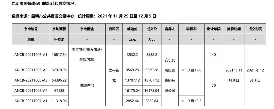 土地市场,当周无新增地块供应。成交方面,安宁太平新城 5 宗地块成交,均由安宁发展投资集团有限公司以 4.58 亿元竞得,楼面价 1008.17 至 1260.08 元/平方米。
