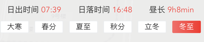 选定节气后,日出时间、日落时间、昼长以及日照情况也会随之展现,可以更直观的了解不同节气的日照变化。
