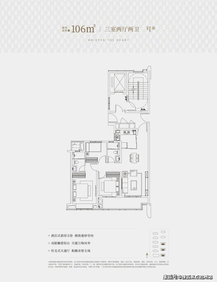建筑面积约106㎡户型,专为都市白领设计,酒店式套房主卧、双联瞰景阳台、社交式大通厅,一方朴实的空间,是浮躁世界里为自己预留的心岛。