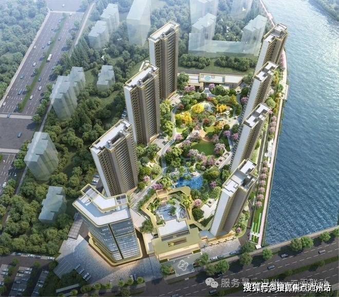 项目西侧滨临天然水系,设置沿岸滨水樱花步道,打造家门口的网红打卡点;内部以大围合景观设计,超百米楼间距,保留自然的呼吸感,打造都会之上的公园⼤境。园区内外生态沉浸,演绎与自然共生的诗意栖居。