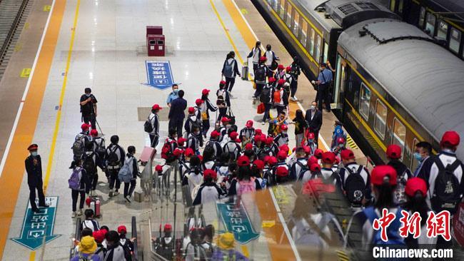 图为学生在兰州西站乘坐红色研学专列。 田多伟 摄
