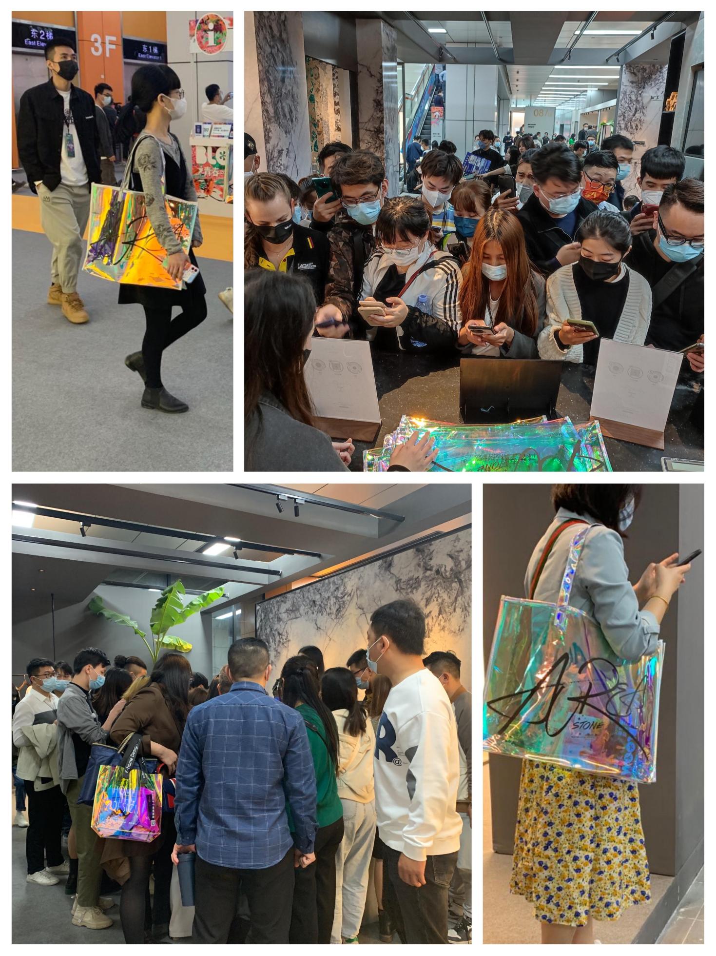 当多年轻设计师的追捧,衣柜透光板、弯曲全覆盖浴缸、异形工艺摆件等,成为设计周新晋网红打卡地,定制PVC镭射袋更是火爆全场,一跃成为展会上的流量收割机。
