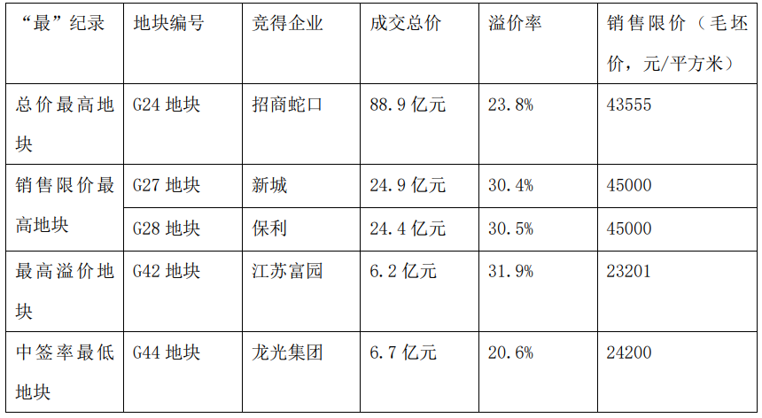 而万科竞得的麒麟G47地块,成交总价14.2亿元,成交楼面价约为22702元/平方米,未来毛坯销售限价28500元/平方米,溢价率30.3%,预期销售利润率仅为0.3%。此外,新城竞得的G43地块和G46地块的预期销售利润率分别为0.6%和1%,保利竞得的G28地块预期销售利润率0.9%。
