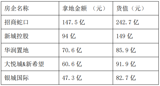 从拿地金额来看,仅招商蛇口一家的成交金额占本批次供地总成交金额992.5亿元的15%。紧随招商蛇口后,拿地金额位列第二名和第三名的分别为新城和华润,分别为94亿元和70.6亿元。