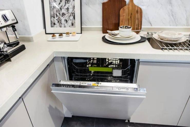 为了使厨房空间更具观赏性,设计师将烟机、冰箱、洗碗机隐藏,厨房整体线条更加流畅。