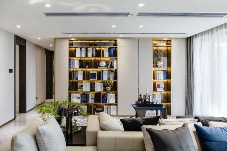 整个客厅空间都选用雅致简约的色调,柜体线条感十足,看起来流畅美观。沉稳的奶油灰烤漆柜配以金属展示格,盛放着千帆阅尽后的气定神闲与优雅。