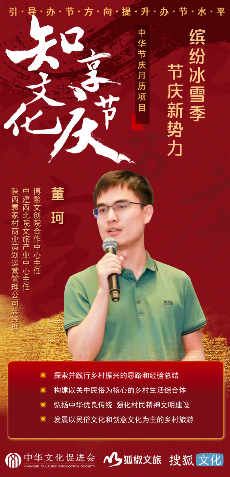12月28日,《知文化·享节庆》主题沙龙暨1月节庆月历发布活动圆满举行。诗人、学者、《节日之书:余世存说中国传统节日》作者、《时间之书:余世存说二十四节气》作者余世存,博鳌文创院合作中心主任、中建西北院文旅产业中心主任、陕西袁家村商业策划运营管理公司总经理董珂,与狐椒文旅主编曹延、搜狐文化主编任慧一起,围绕主题“文化暖冬季,节庆迎新年”,就中华优秀节庆的新型传播和赋能、国内文旅产业发展的新阶段,以及节庆文化在打造城市旅游IP、助力乡村振兴等方面发挥的带动作用等诸多话题展开了对谈,并正式发布了由中华文化促进会、狐椒文旅、搜狐文化共同推出的《中华节庆月历|1月节庆》。