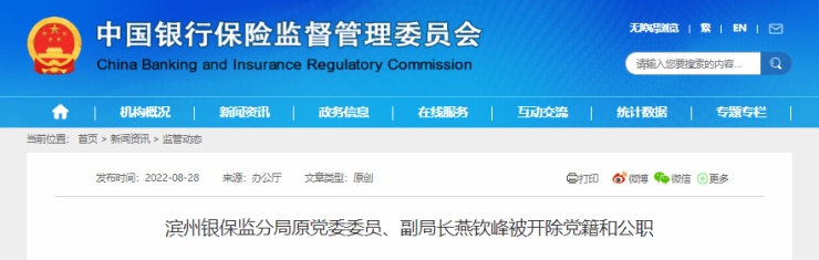 滨州银保监分局原副局长燕钦峰被双开,涉嫌高利转贷犯罪