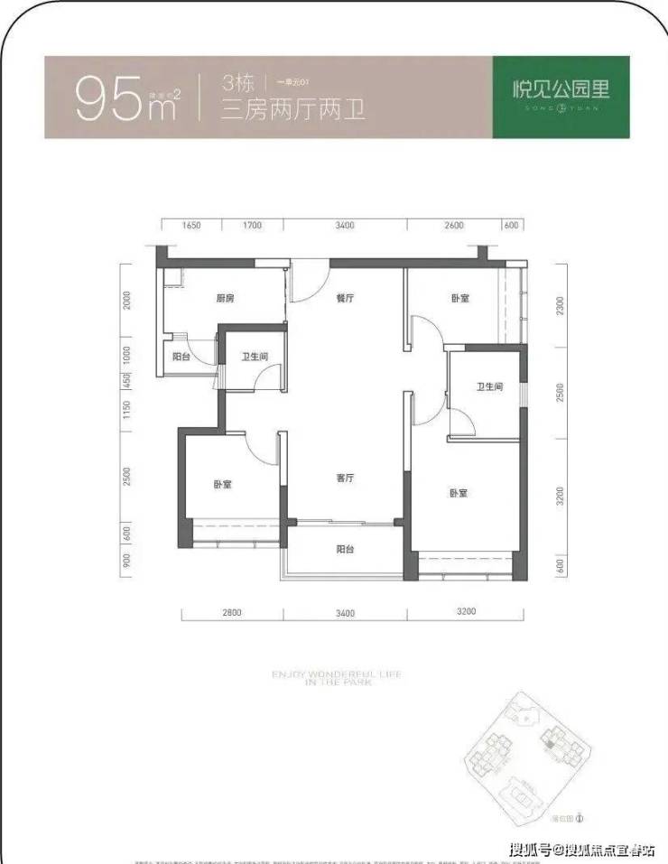 95㎡的3房2厅2卫,仅3栋1单元01户型,设计的是竖厅双龙抱珠格局,客厅3.4米开间,三开间朝南,3个卧室分别做到了3.2米/2.8米/2.3米的宽度,L型厨房带1个生活阳台,公卫三段式分离,得房率73.71%(不含赠送),西南朝向。