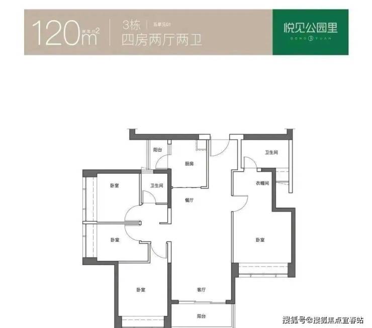 120㎡的4房2厅2卫,仅3栋5单元01户型,设计的是创新式双龙抱珠格局,L型厨房,公卫三段式分离,得房率74.13%(不含赠送),东南朝向。