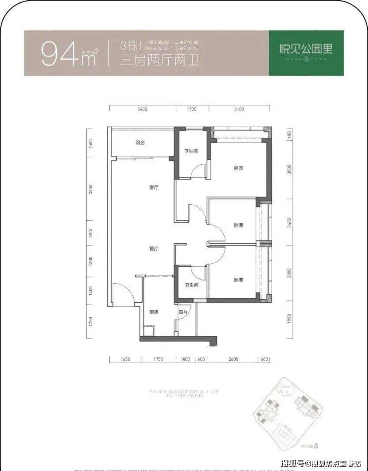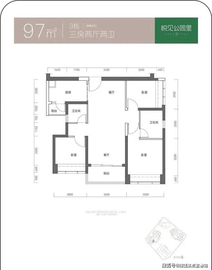 97㎡的3房2厅2卫,仅3栋4单元01户型,设计的是竖厅双龙抱珠格局,客厅3.4米开间,三开间朝南,3个卧室分别做到了3.2米/2.8米/255米的宽度,L型厨房带1个生活阳台,公卫三段式分离,得房率73.61%(不含赠送),东南朝向。