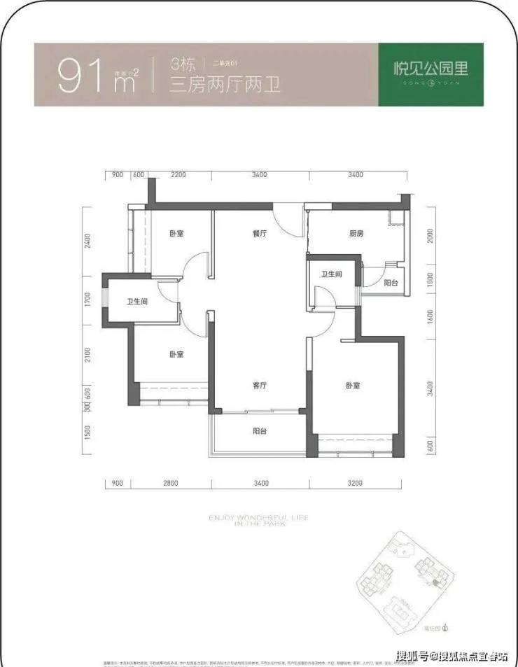 91㎡的3房2厅2卫,仅3栋2单元01户型,设计的是竖厅双龙抱珠格局,客厅3.4米开间,三开间朝南,3个卧室分别做到了3.2米/2.8米/2.4米的宽度,L型厨房带1个生活阳台,卫生间干湿分离,得房率73.55%(不含赠送),西南朝向。