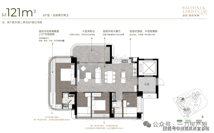 双龙抱珠户型,书房分布于客厅另一侧,且难得是双面采光+270°景观视野。主卧南北通透,且拥有十分开阔的景观面。贯通式阳台联通客厅以及靠近动区的次卧,实现长观景阳台。