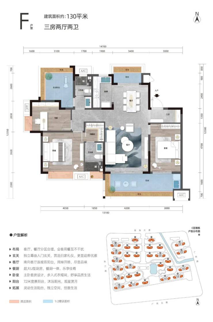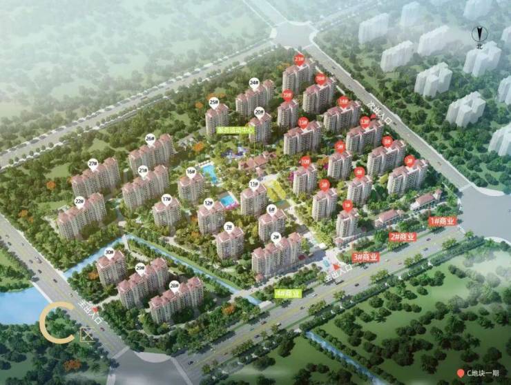 项目分A、B、C三个地块开发,A地块1936户已于2016年全部交付入住;B地块743户,6-7号楼已封顶,1-5号楼及31栋低层住宅建设中;C地块933户,13#、14#、18#、19#、23#楼为首批开盘房源。在售主力户型为C区建面106㎡ 2+1房、130㎡ 3+1房,B区建面76-83㎡两房、103㎡三房,精装交付标准2000元/㎡,均价约13500元/㎡,总价约100-180万元/套。