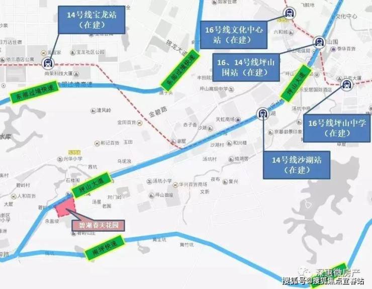 临近地铁14号快速线(在建,预计2022年开通)宝龙站及坪环西站,临近16号线(在建)坪山围站,19号线31号线(规划中),未来地铁开通运营碧湖春天的交通便捷性将大大提升。