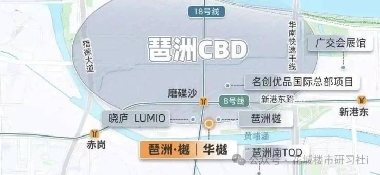 项目位于海珠区琶洲西,紧邻地铁8号线与18号线交汇的磨碟沙站,步行直线约200米。