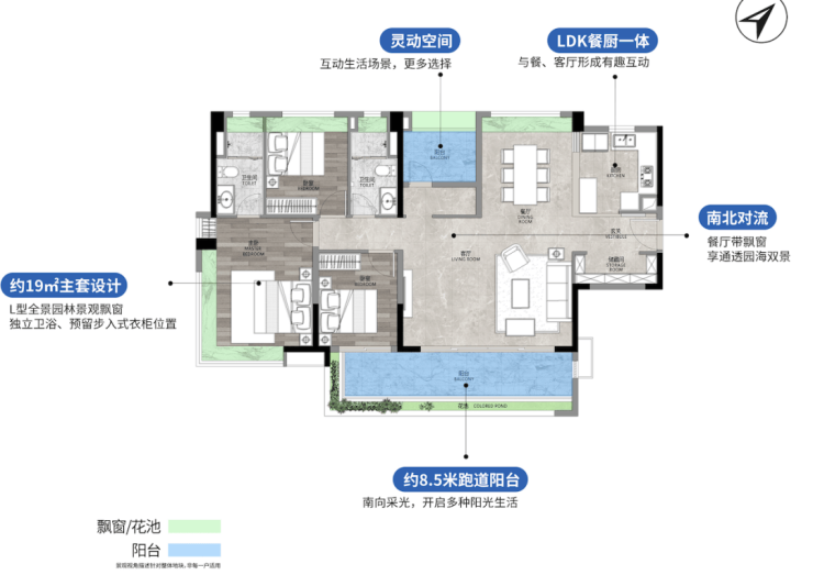 82㎡三房两卫,小户横厅重出江湖,片区内绝版横厅小户强势补货。南北对流,四开间超11米采光,270度超大角度采光,海园双景皆可拥有。