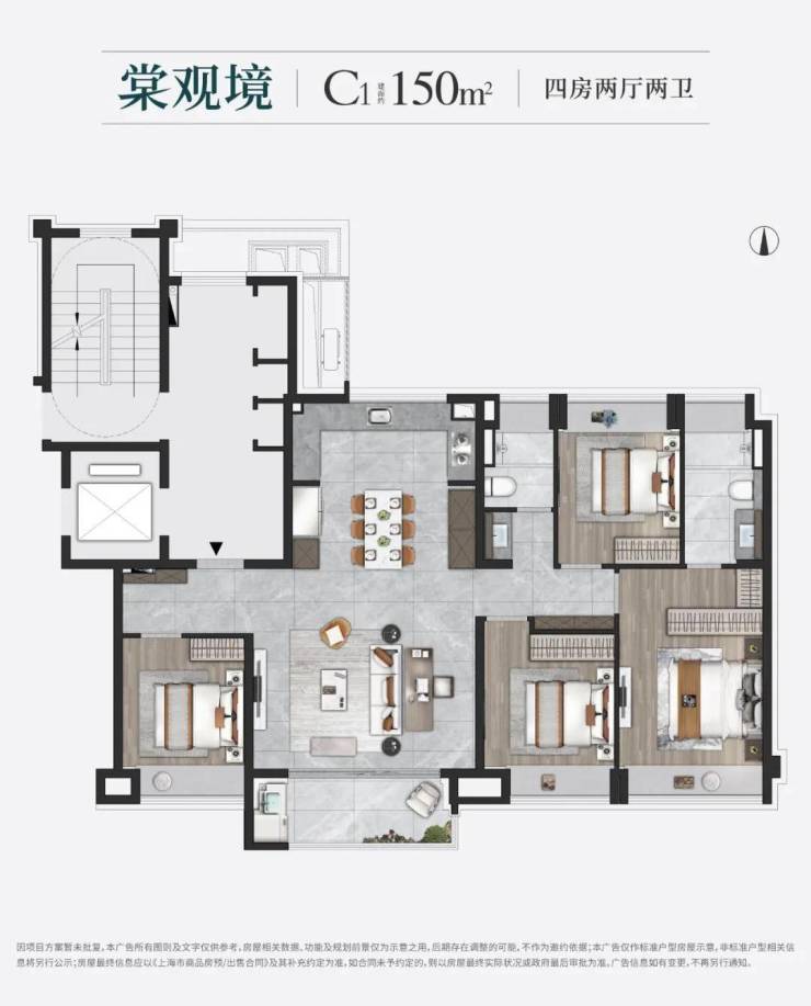 约150㎡4房2卫户型类一梯一户的居住体验,业主能独享一整个电梯厅,加上入户玄关的配置,私密性相当高。