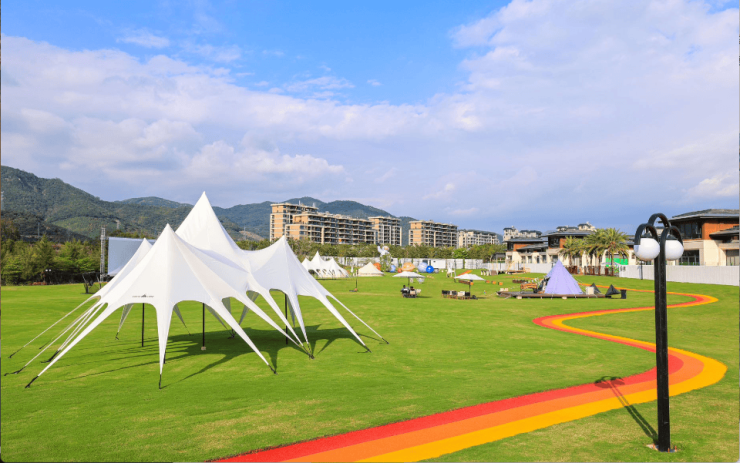 20000㎡草坪营地已于,融入ENCOFFEE咖啡吧、BBQ、野奢帐篷、飞盘体验、520m彩虹慢步道等丰富设施,打造三亚全新城市微度假目的地。