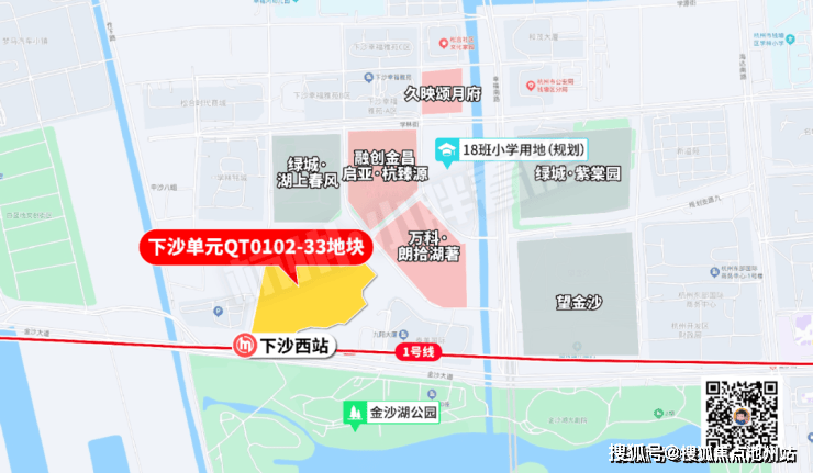 今年1月14日,绿城以201291万元的总价,2.344万/平的楼面价,41.5%的溢价率,高价竞金沙湖北面核心地块,地块名曰:下沙单元QT0102-33地块;也就是现在的绿城湖映金沙轩项目。