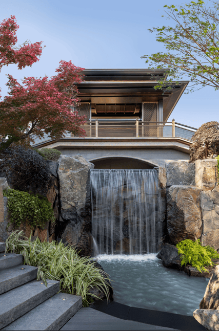 写仿西湖十景,取意郭庄形制,引湖入园、循序渐进,复现九溪烟树况味;景观中轴、风雨连廊、花园景致等将建筑与园林相融一起,依循自然缓坡地势,营造意韵悠扬的禅境园林,呈现小中见大、园中有园、景中有景、曲径通幽之境,将西湖的精致山水写仿入园,于方寸之间纳藏万千气象。