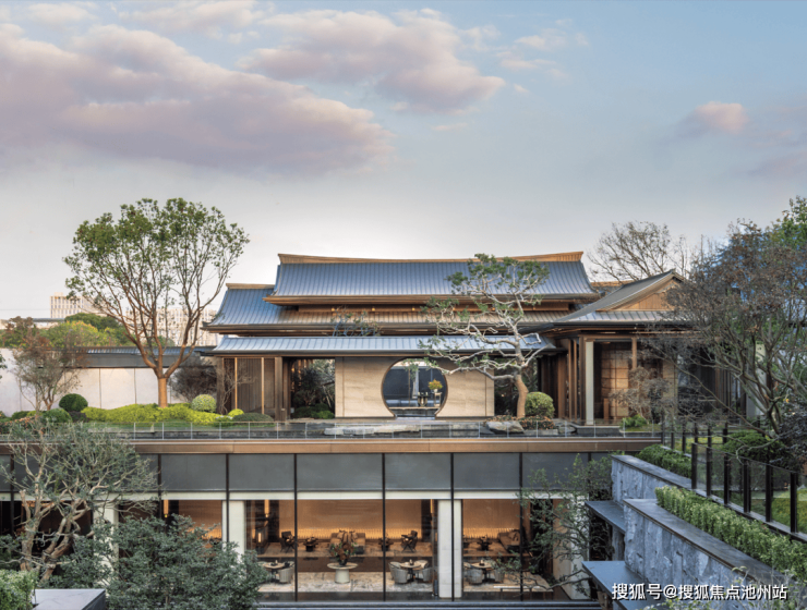设计追溯杭城深厚古韵,以“重檐双坡,叠叠弄潮”的意向诠释屋顶下瞰江栖居的诗意:杭州高定府苑双坡屋面形制、高台宫殿的立面构图、重檐高阁的视觉层次感与传统木构语言的提炼与转译……师古不泥,精研匠筑,呈现清雅朴拙的禅静中式建筑意境。