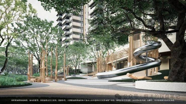 【下沉榕巢乐园】设计师保留了小区最南侧地块原高度及原生古榕树,巧妙结合做了下沉式榕巢乐园,提供全龄互动体验的自然乐园。