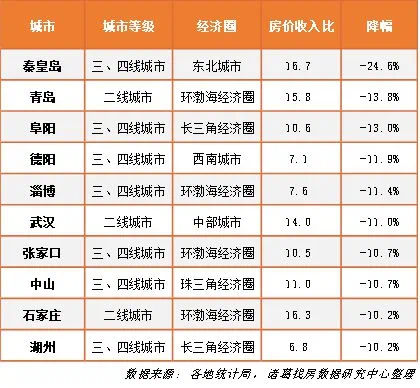 而从房价收入比下降的城市来看,环渤海城市占据近半数份额,由于缺乏产业支撑,人口吸附能力弱,加之2020年疫情的影响,环渤海经济圈部分城市房价进入下滑通道,带动房价收入比下降。其中,秦皇岛位居房价收入比降幅首位,2020年房价收入比为16.7,较去年下降了24.6%,其次为青岛,房价收入比为15.8,较去年下降13.8%。