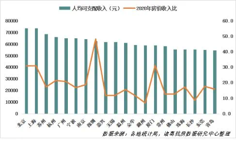 图:2020年城镇居民人均可支配收入TOP20城市房价收入比情况