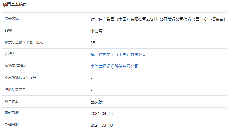 焦点财经讯 4月15日,上交所显示,建业住宅集团(中国)有限公司2021年公开发行公司债券(面向专业投资者)项目状态显示为“已反馈”。