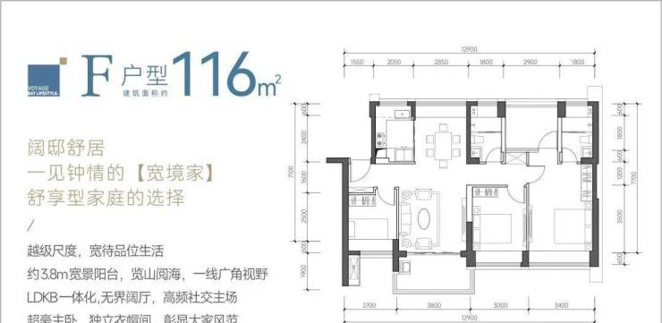 116㎡的4房2厅2卫,F户型,设计的是竖厅南北通透格局,餐客厅一体化设计,客厅3.8米开间,四开间朝南,4个卧室分别做到了主卧18.02㎡/次卧12.3㎡/次卧8.7㎡/次卧8.37㎡(包含墙体飘窗),都不用搭配飘窗做床,L型厨房,卫生间干湿分离,得房率约:88%(包含赠送),阳台主朝西南或东南向。