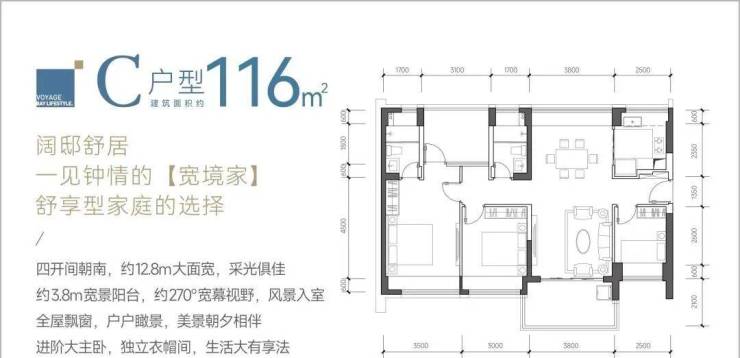 116㎡的4房2厅2卫,C户型,设计的是竖厅南北通透格局,餐客厅一体化设计,客厅3.8米开间,四开间朝南,4个卧室分别做到了主卧17.85㎡/次卧11.4㎡/次卧9.3㎡/次卧8㎡(包含墙体飘窗),都不用搭配飘窗做床,U型厨房,卫生间干湿分离,得房率约:93.13%(包含赠送),阳台主朝西南、东南或正南向。