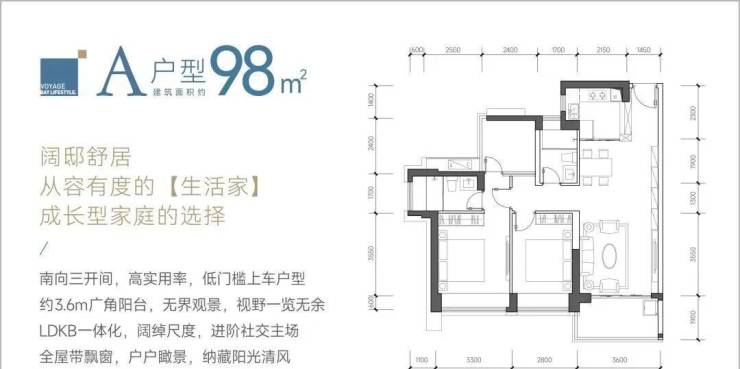98㎡的3房2厅2卫,设计的是经典竖厅格局,LDKB一体化设计,客厅3.6米开间,三开间朝南,动静分区,3个卧室分别做到了主卧13.69㎡/次卧11.62㎡/次卧5.76㎡(包含墙体飘窗),都不用搭配飘窗做床,L型厨房,卫生间干湿分离,得房率约:89%(包含赠送),西南、东南或正南朝向。