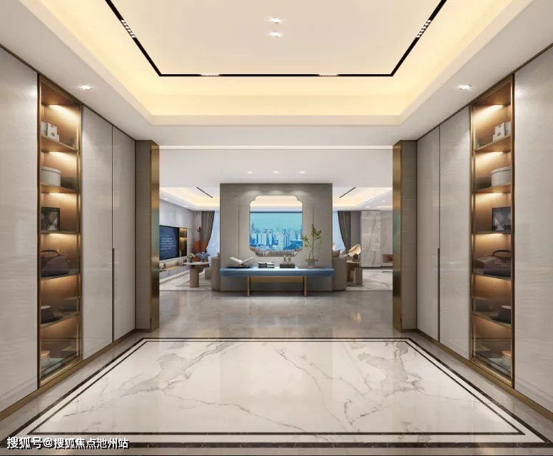 开门入屋,约6米进深的玄关,逐渐展现在眼前。米白玫瑰金的色彩设计,富丽雍容,将归家仪式感拉满。
