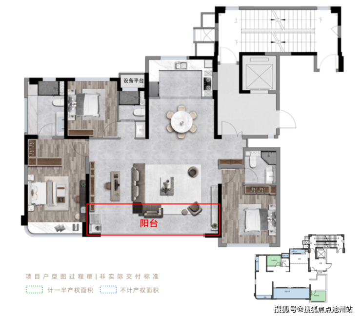 以139方为例,如果把客厅外的阳台独立隔出来,客厅的空间尺度就“出问题”了。