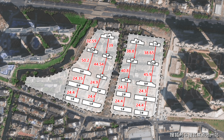 ▲部分楼栋间距示意。底图为项目报批文本,或有误差,以实际为准
