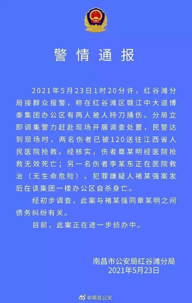 5月23日,江西一知名房地产老板被杀案件引起广泛关注,犯罪嫌疑人致一死一伤,并在作案后自杀身亡。民警到达现场时,两名伤者已被送到江西省人民医院抢救,伤者章某经医院抢救无效死亡;另一名伤者李某正在医院救治目前暂无生命危险。